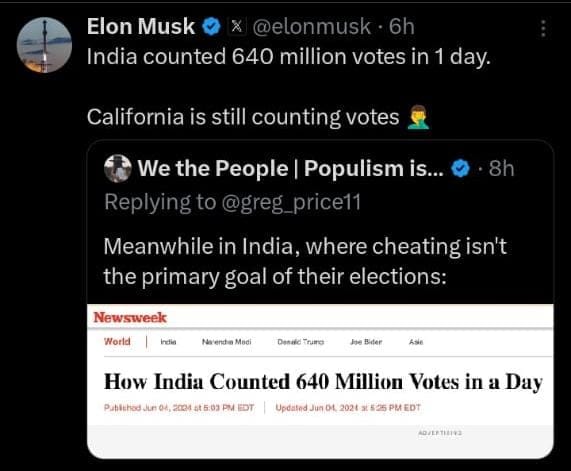 Musk expressed his appreciation for India’s political process on the social media site X, which was formerly known as Twitter. He emphasized that during the Lok Sabha elections, India was able to tally 640 million votes in a single day. California, on the other hand, continued to tally votes weeks after the US presidential election.